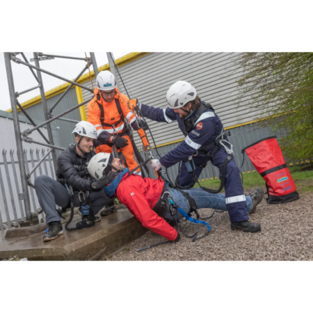 At the core of the system is a certified descender, purpose-built to support the controlled lowering of two individuals. This makes it particularly effective for rescues where a casualty may be unconscious or unable to descend unaided, and where being accompanied can significantly increase safety.
