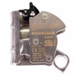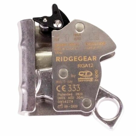 The device is fitted with a manual safety lock for secure engagement and is certified for use in both fall arrest and rope access applications, in accordance with EN 353-2:2002 and EN 12841:2006-A standards. It delivers a maximum arrest force of under 6kN when used with compatible rope, such as the RIDGEGEAR RGRO11.